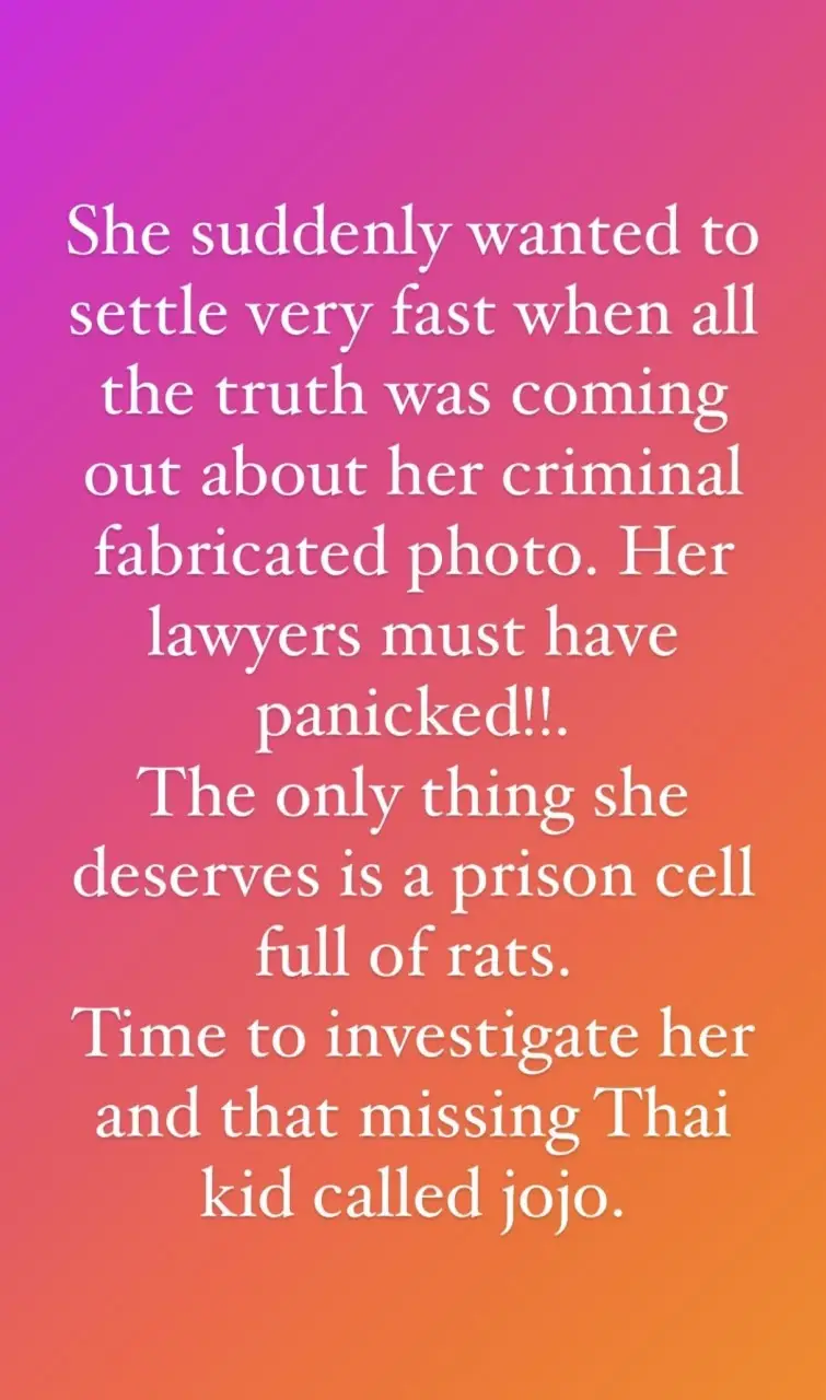 Elsewhere on her page, she wrote: “Time to investigate her and that missing Thai kid called JoJo.”