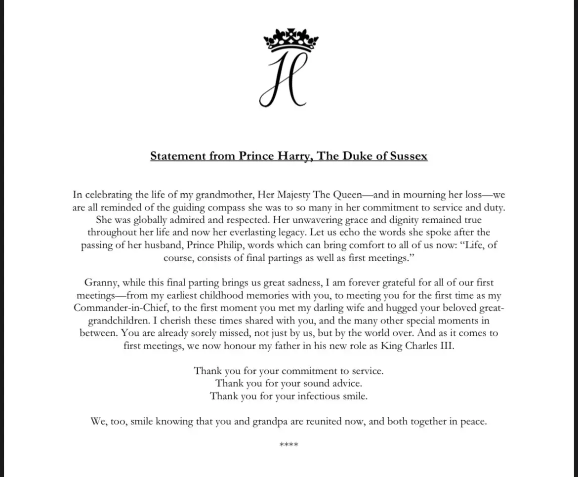 "Granny, while this final parting brings us great sadness, I am forever grateful for all of our first meetings - from my earliest childhood memories with you, to meeting you for the first time as my Commander in Chief, to the first moment you met my darling wife and hugged your beloved great-grandchildren," Harry said.