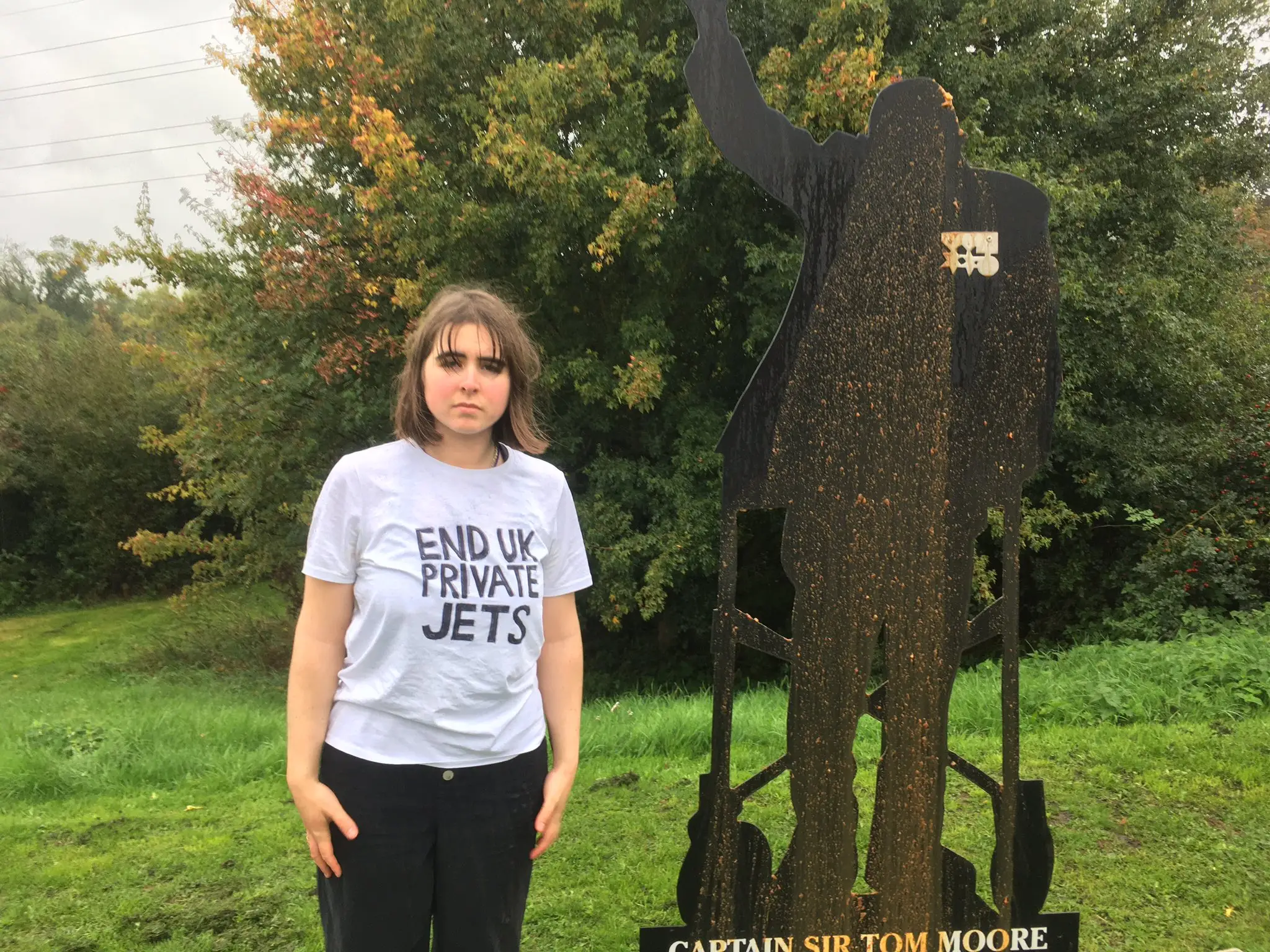 In footage shared on the End UK Private Jets social media pages, 21-year-old Maddie Budd could be seen approaching the memorial, which is shaped like the late British Army officer turned fundraiser, in Thistley Meadow, in Hatton, Derbyshire, carrying a large container.