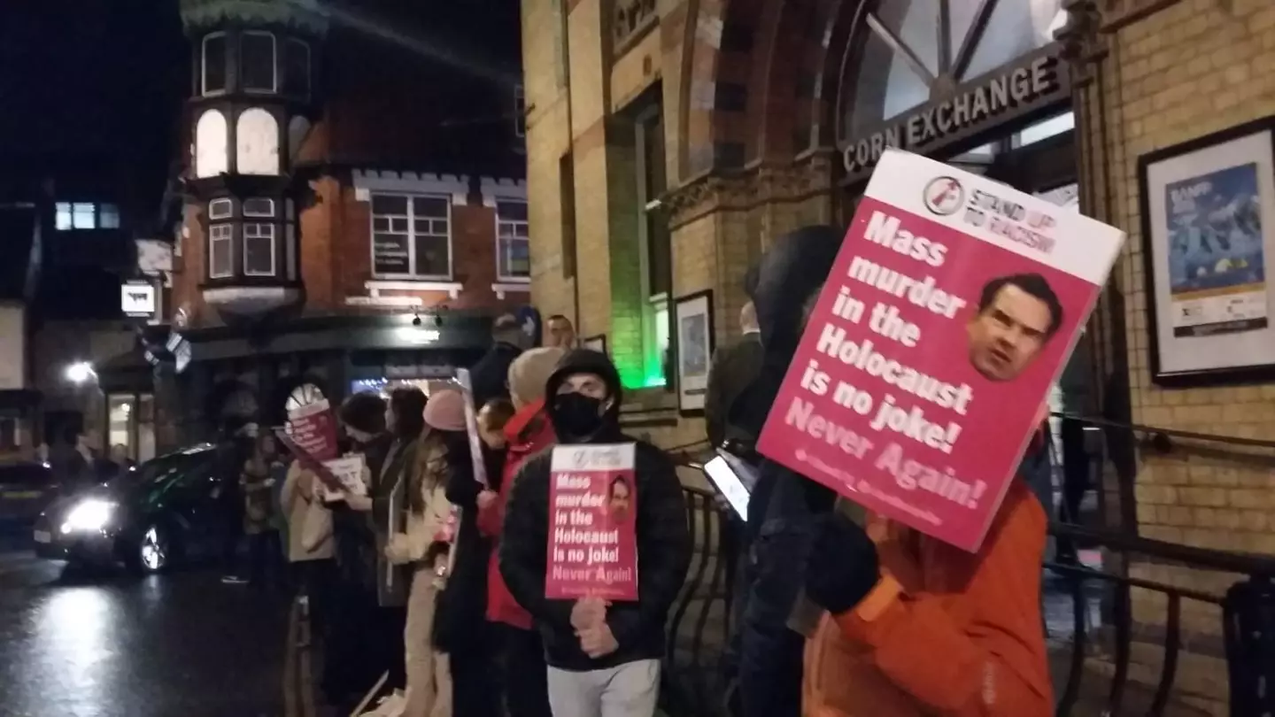 Campaigners have been seen outside the Corn Exchange in Cambridge tonight (16 February), where Carr is due to perform, with many holding placards that said: “Mass murder in the Holocast is no joke! Never again!”