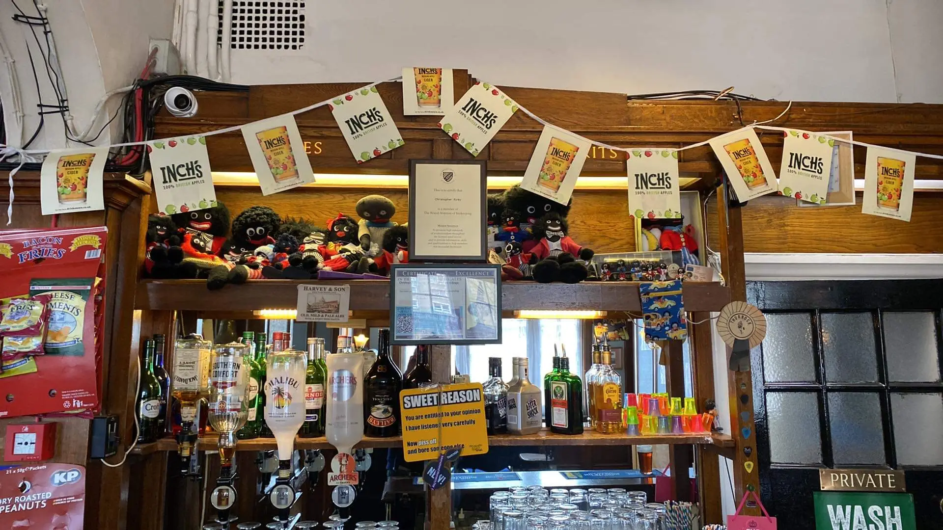 There is a sign on the venue that says 'We have golly dolls displayed inside on our shelves. If you feel offended. Please do not enter'.