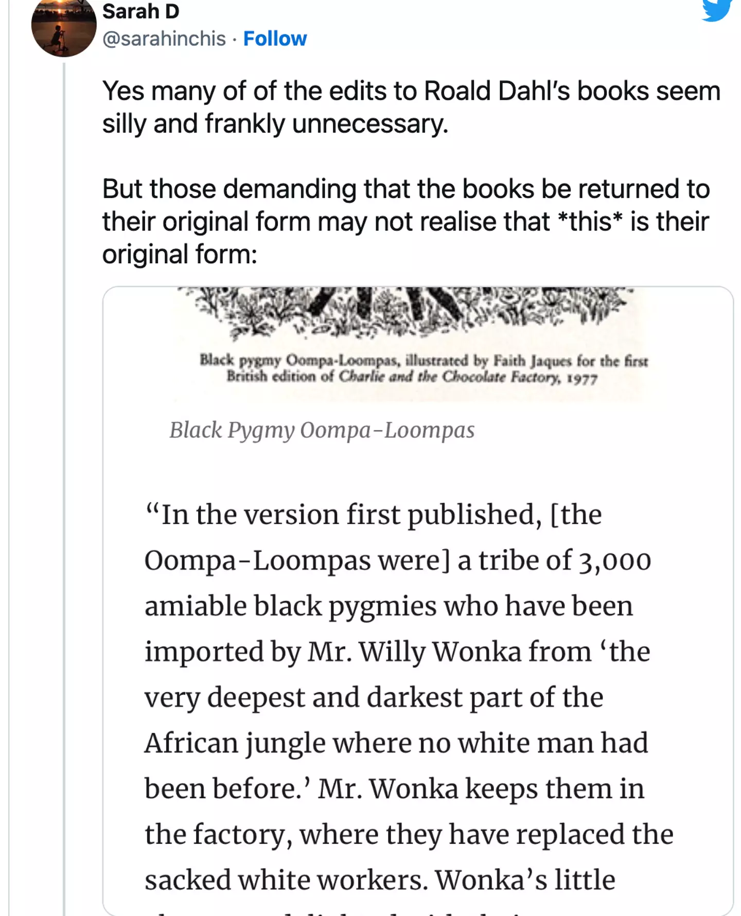 In 2020, they hired sensitivity writers and worked with children's literature collective Inclusive Minds to go back into Dahl's works and review the author's language so the books 'can continue to be enjoyed by all today'.