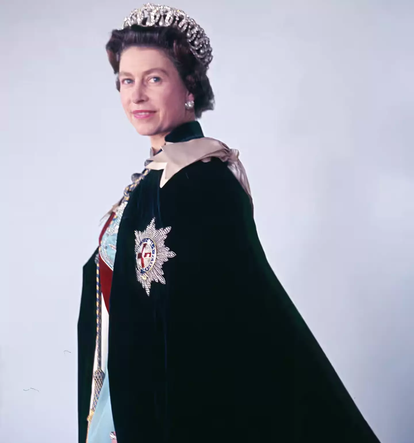 It shows Elizabeth II in full royal regalia with her crown and her Order of the Garter star.