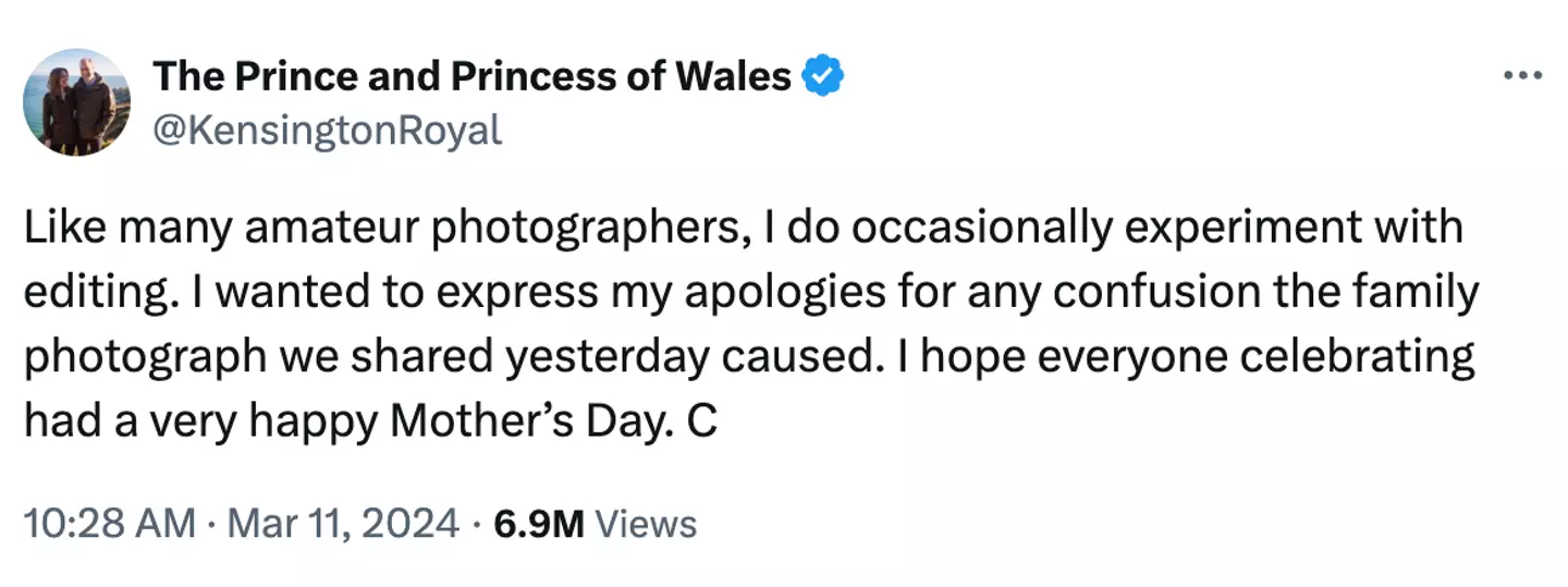 "I wanted to express my apologies for any confusion the family photograph we shared yesterday caused. I hope everyone celebrating had a very happy Mother’s Day. C."