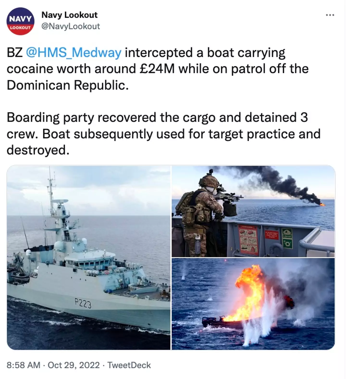 Navy Lookout shared the news on Twitter, posting the images while writing: "@HMS_Medway intercepted a boat carrying cocaine worth around £24M while on patrol off the Dominican Republic.