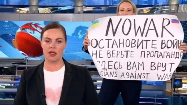 Channel One editor Marina Ovsyannikova burst onto the set of the daily news bulletin last night (Monday 14 March), shouting: “Stop the war. No to war.”