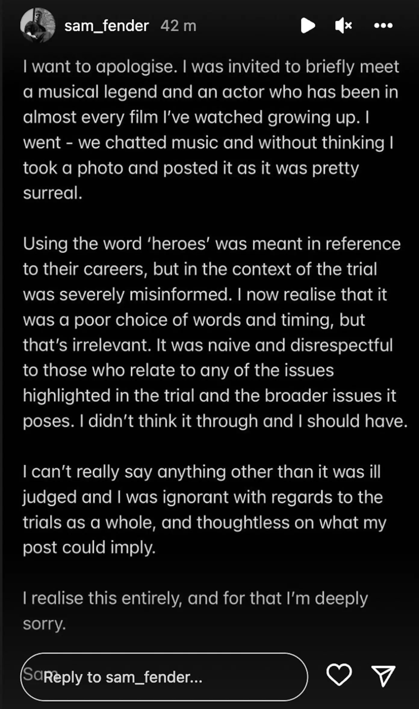 “It was naive and disrespectful to those who relate to any of the issues highlighted in the trial and the broader issues it poses. I didn’t think it through and I should have.”