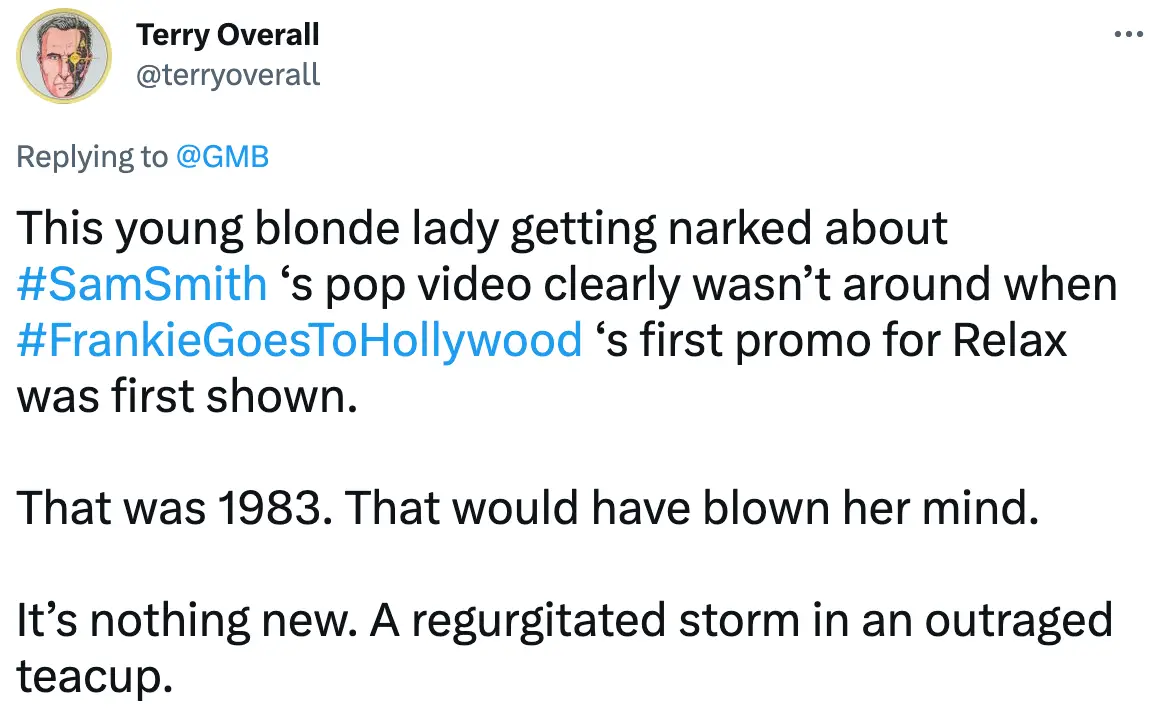 While a third added: “This young blonde lady getting narked about #SamSmith‘s pop video clearly wasn’t around when #FrankieGoesToHollywood‘s first promo for 'Relax' was first shown. That was 1983. That would have blown her mind. It’s nothing new. A regurgitated storm in an outraged teacup.”