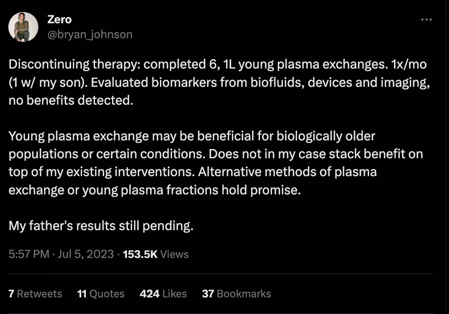 "Young plasma exchange may be beneficial for biologically older populations or certain conditions. Does not in my case stack benefit on top of my existing interventions.