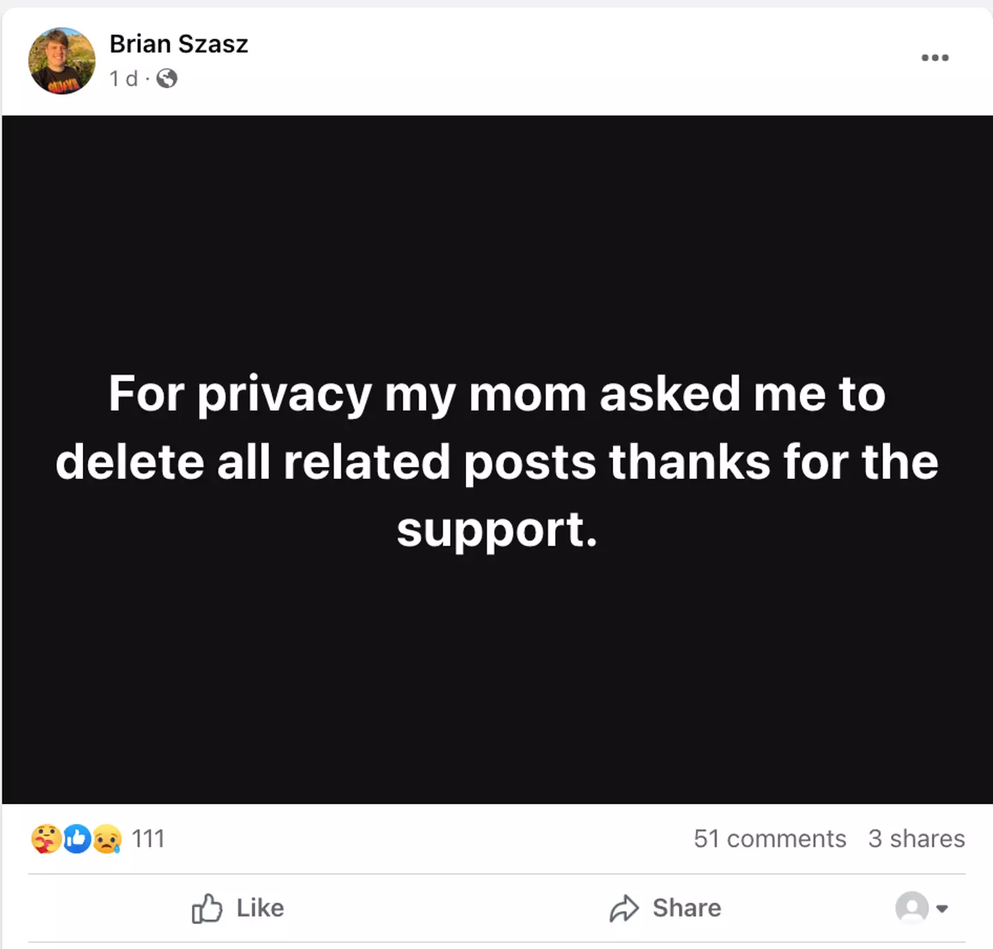 He later shared a post that read: "For privacy, my mom asked me to delete all related posts thanks for the support."
