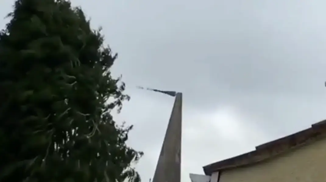 Watch a video of the spire tumbling down here: