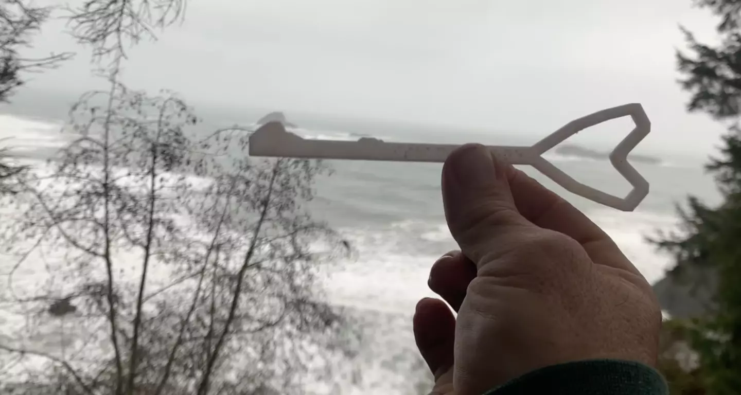 When aligned with rocky outcrops off the coast, which match the key’s teeth, the handle of the key encircles Flatiron Rock in a heart.