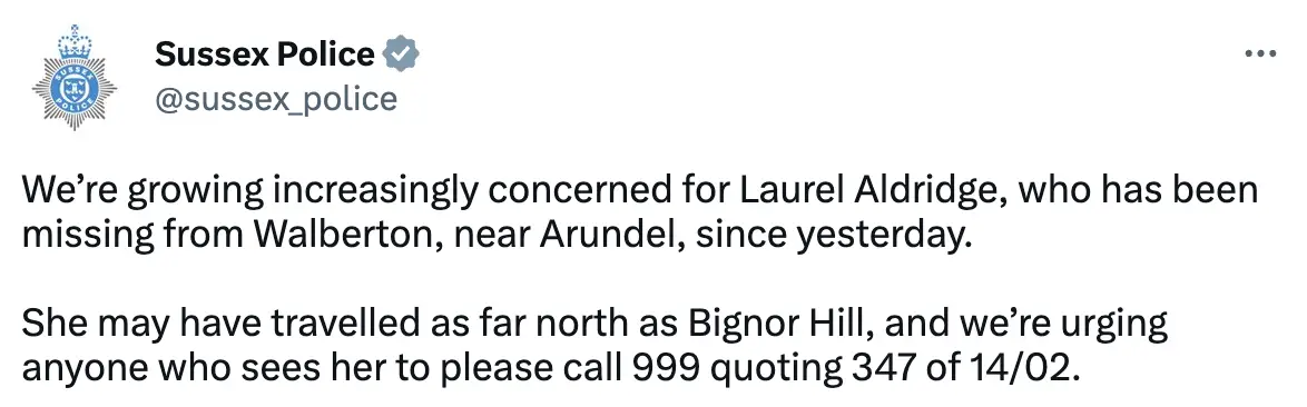 They posted: "We’re growing increasingly concerned for Laurel Aldridge, who has been missing from Walberton, near Arundel, since yesterday."