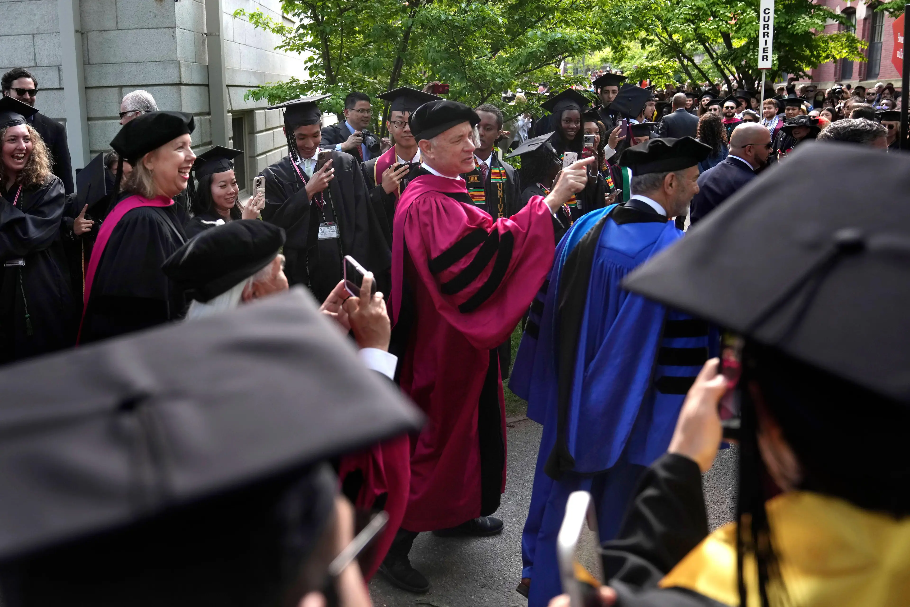 Harvard President Lawrence Bacow, presiding over his last commencement before stepping down, also presented Hanks with a Harvard volleyball, in a tribute to Wilson from Cast Away.