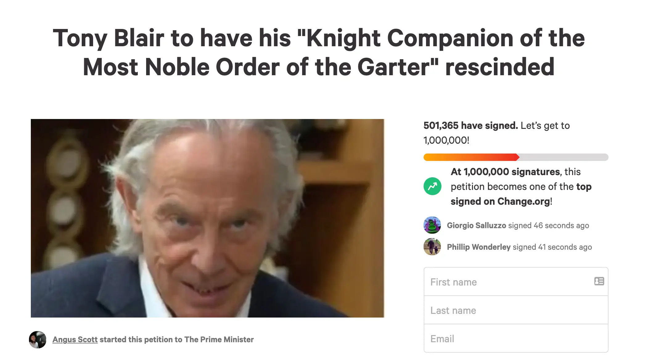 Shortly after the announcement was made, a petition was set up by Angus Scott on change.org titled Tony Blair to have his ‘Knight Companion of the Most Noble Order of the Garter’ rescinded, which has, at the time of writing, hit over 501,000 signatures.