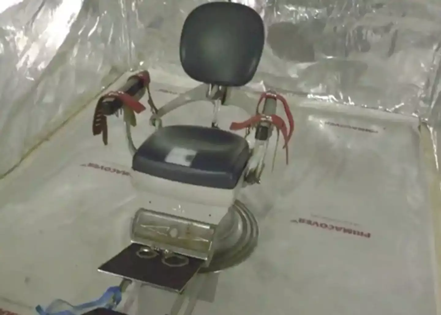 The other container, however, had a dentist chair inside, which was fitted with ankle and wrist restraints.