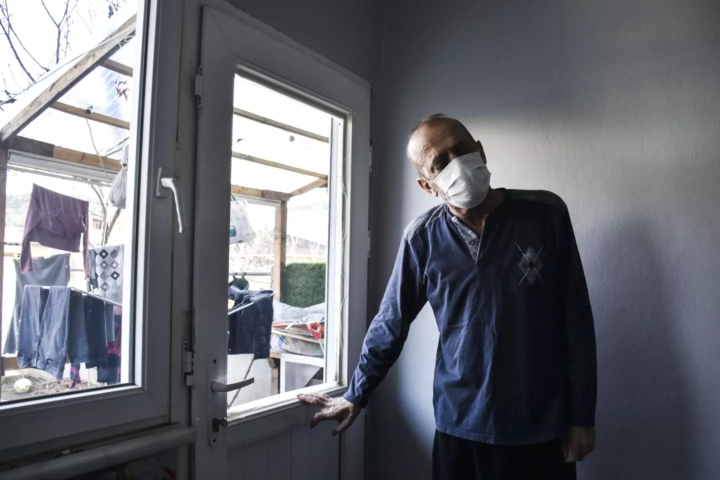 His granddaughter Azra has to stay in the garden while visiting, talking to her relative through the glass back door.