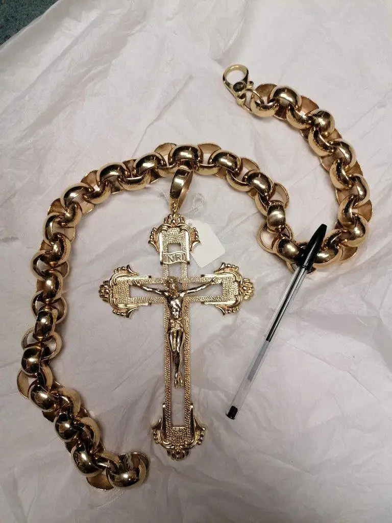The nine inch long crucifix is made of nine carat gold and attached to a thick, heavy chain of the same metal.