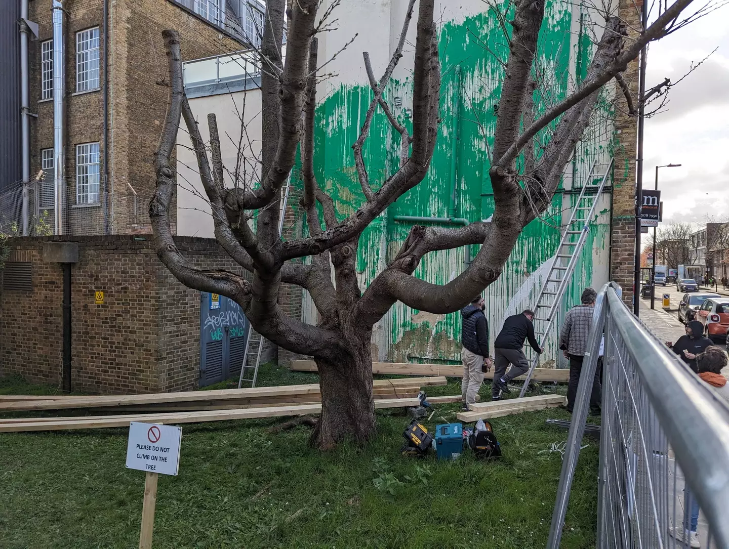 It's obviously open to interpretation, but the artwork on Hornsey Road seems to make reference to the importance of taking care of the environment and our beloved trees.