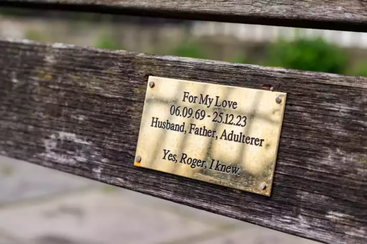 It reads: "For My Love. 06.09.69 – 25.12.23. Husband, Father, Adulterer. Yes, Roger, I knew."