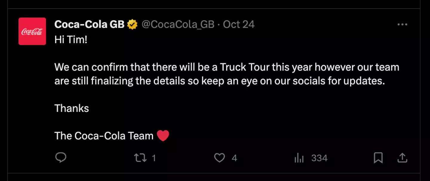 The brand responded: "Hi Tim! We can confirm there will be a Truck Tour this year however our team are still finalizing the details so keep an eye on our socials for updates. Thanks The Coca-Cola Team."