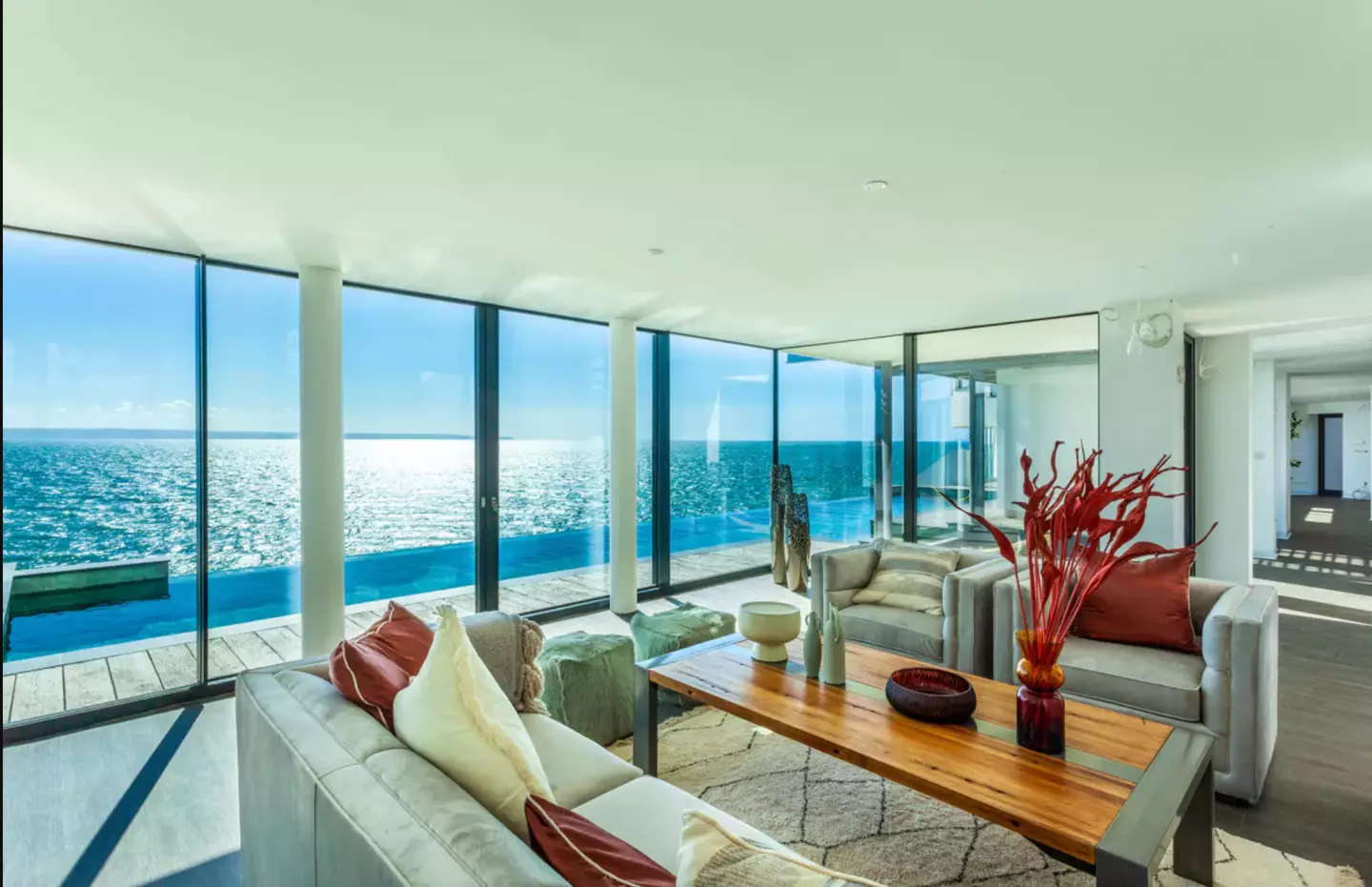 The living room also has sliding glass doors that give direct access to the outdoor infinity pool, which - like the rest of the property - has amazing views of the sea.