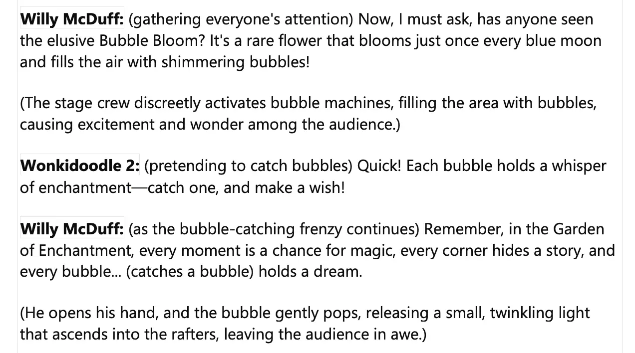 At the end, it anticipates how the audience would react with its final directions: “The guests erupt into applause, celebrating the triumph of creativity and courage over chaos.”