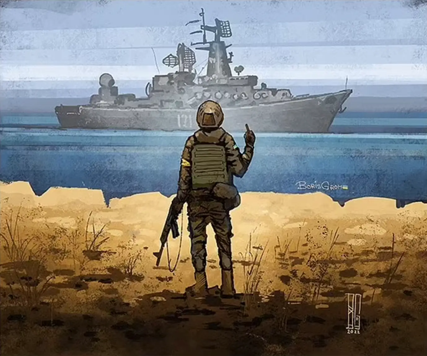The winning design was from artist Boris Groh and shows one of the 13 Ukrainian guards standing on Snake Island facing the warship, rifle in one hand and a defiant middle finger directed towards the ship in the distance.
