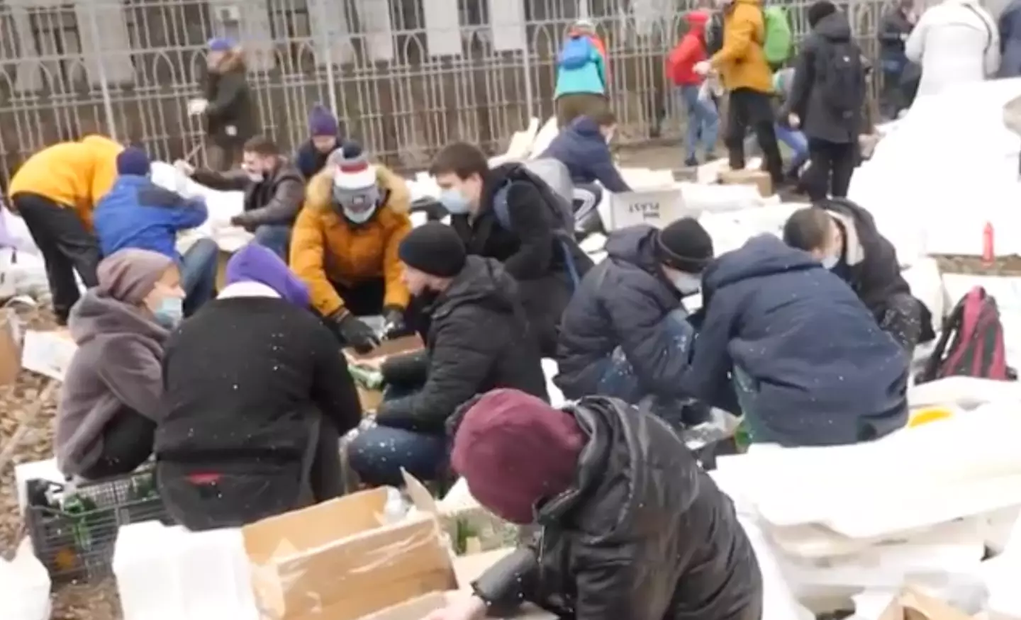 Hundreds of men and women can be seen packing glass bottles with Styrofoam - according to Sky News, the Styrofoam is used as it helps the firebomb to stick to its target.