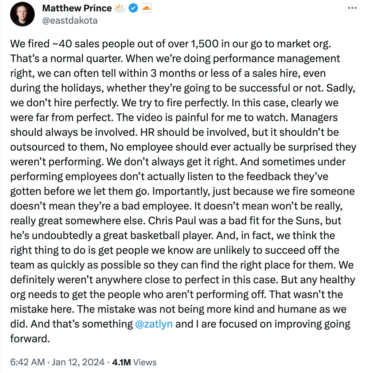 In a statement, he explained the company "fired ~40 sales people out of over 1,500 in our go to market org", which he said was "normal quarter" behaviour.