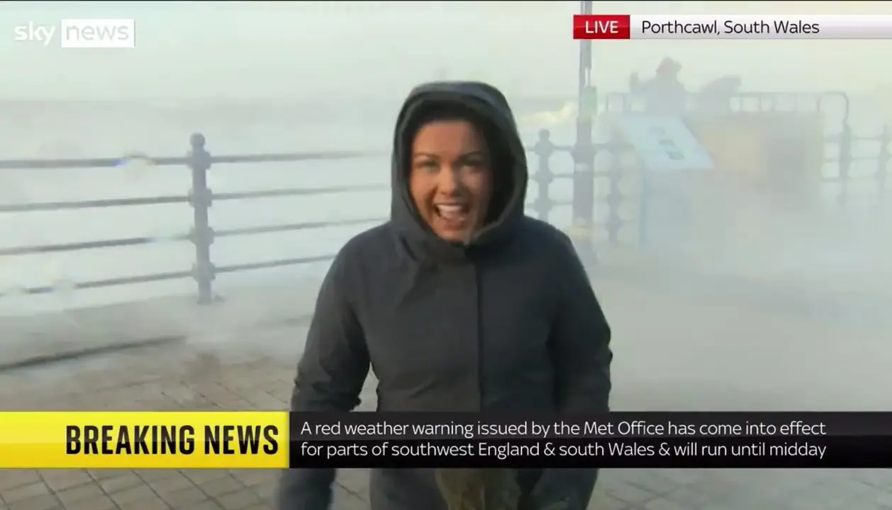 A Sky News reporter attempted to deliver a weather report on Storm Eunice while ironically getting battered by waves as people in affected areas were advised to stay indoors.