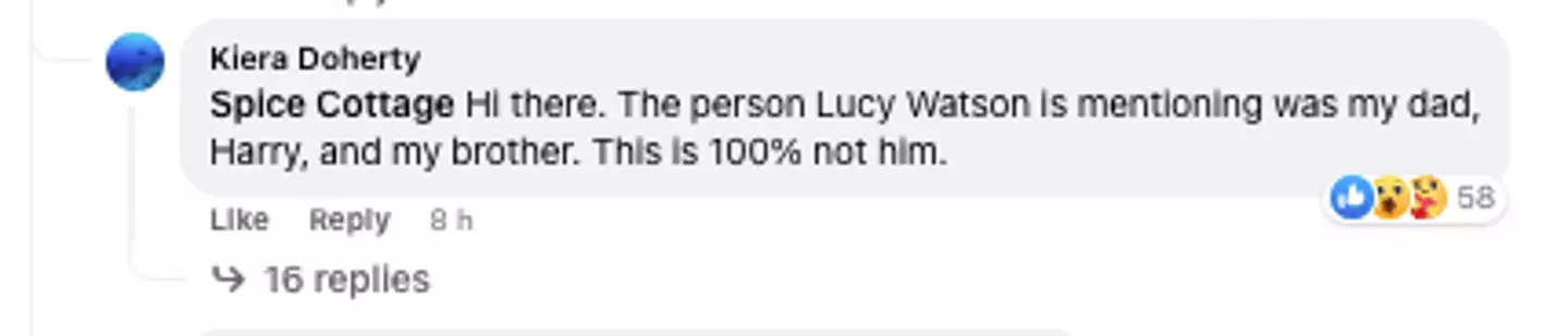Kiera Doherty, who claims to be Harry's daughter, commented: "The person Lucy Watson is mentioning was my dad, Harry, and my brother.