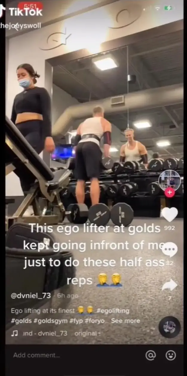User @dvniel_73 looks to have deleted their account after posting the original video, on which the text overlay read: 'This ego lifter at Golds kept going in front of me to do these half-ass reps.'
