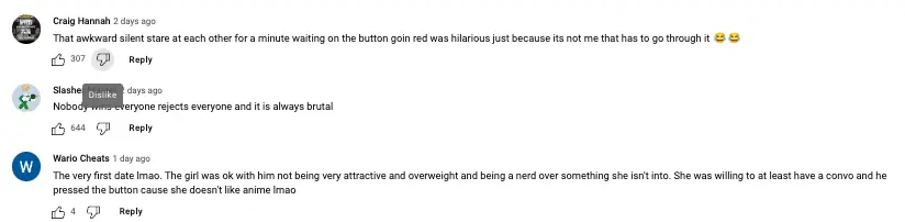 The idea behind the show is that two people are sitting in front of the same button and when it lights up red either contestant can press it and swap out their date for another person.