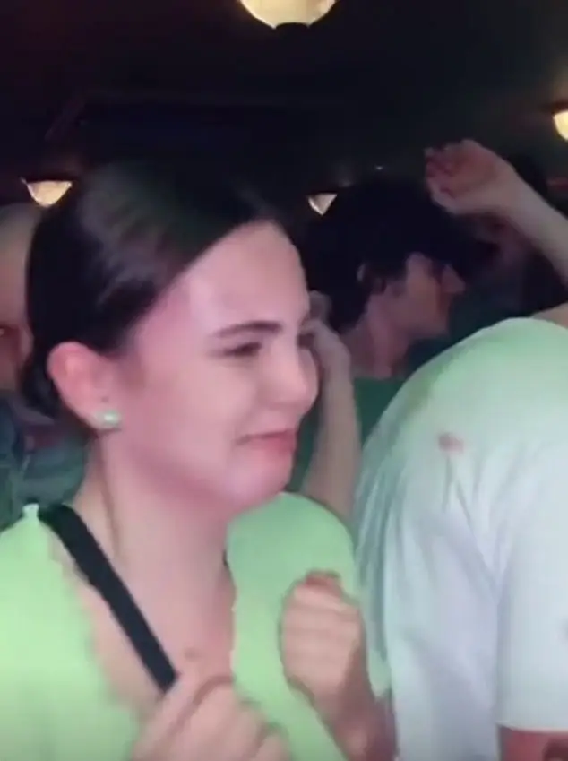 The dude sat in the middle is like 'WTF but I didn't even kiss anyone', while the announcer jokes: "It's going to be an interesting ride home."