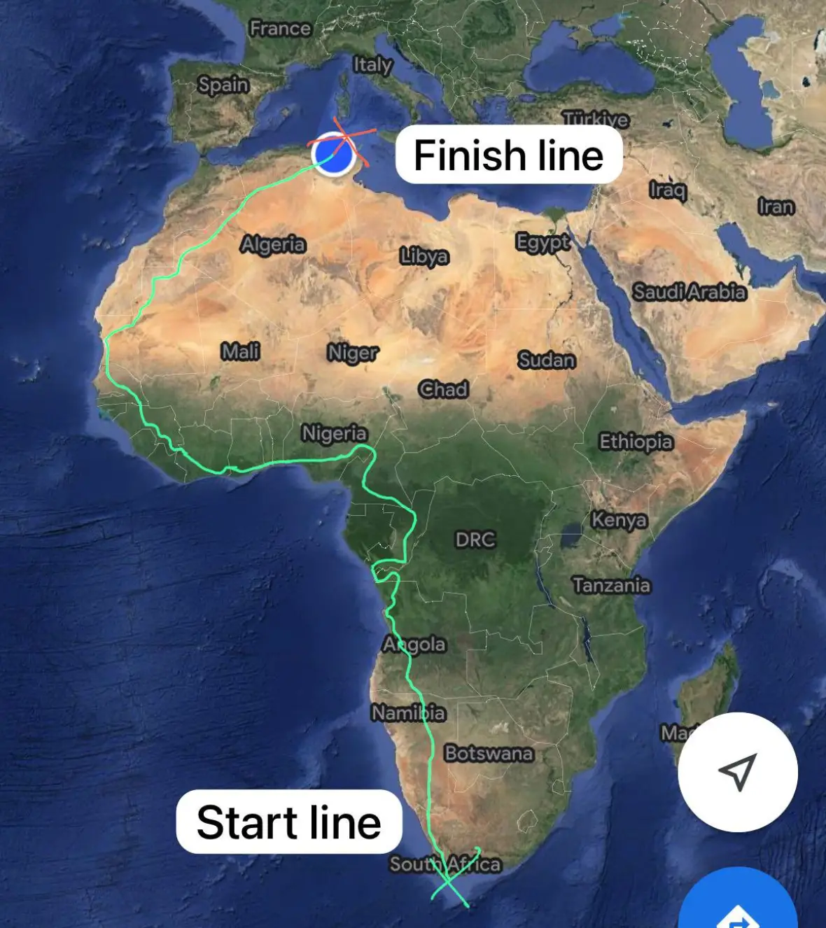 Starting off in South Africa, if all goes to plan he’ll be reaching the tip top of Algeria by the end of this weekend.