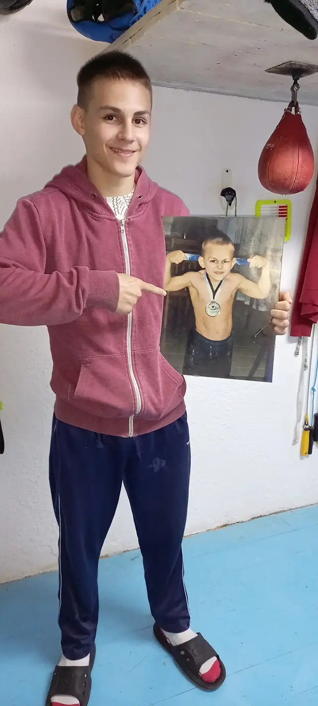 The teen recently shared a snap of himself holding up an old photograph of him as a child flexing his muscles and wearing a large gold medal.