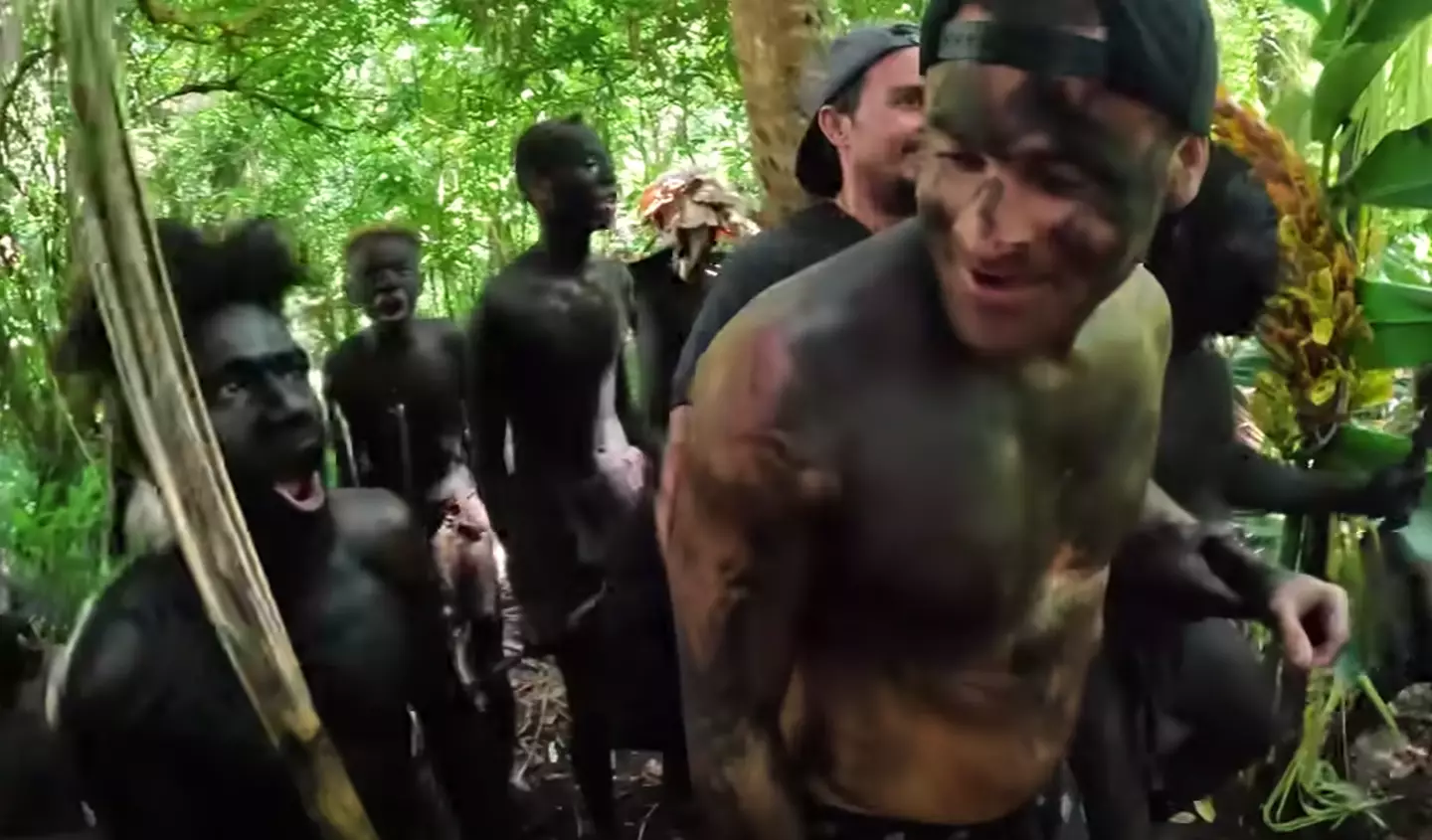 When they land on shore, the tension is palpable as locals dressed in nothing but loincloths and armed with spears rush at them, screaming and chanting.
