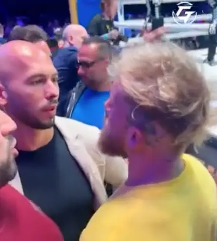 Andrew Tate squares up to Jake Paul after Tommy Fury's exhibition bout in Dubai.