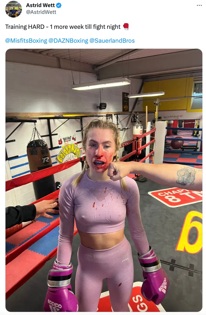 Astrid Wett has shared the grim reality of boxing training in a blood spattered photo ahead of her fight next week.
