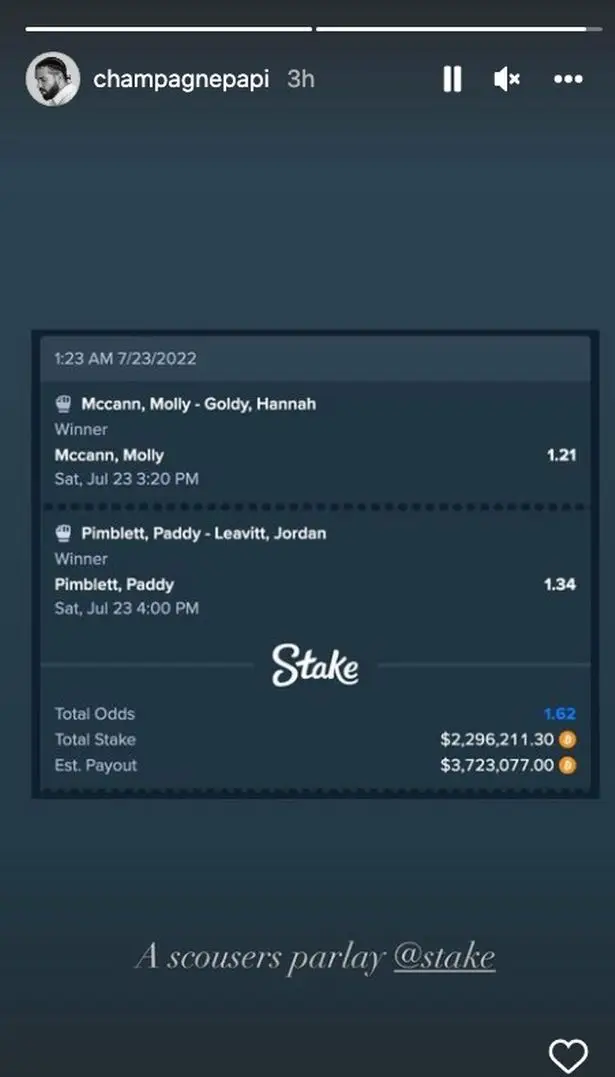Drake posted a screenshot of his betting slip with his 117 million Instagram followers, writing: "A scousers parlay @stake."
