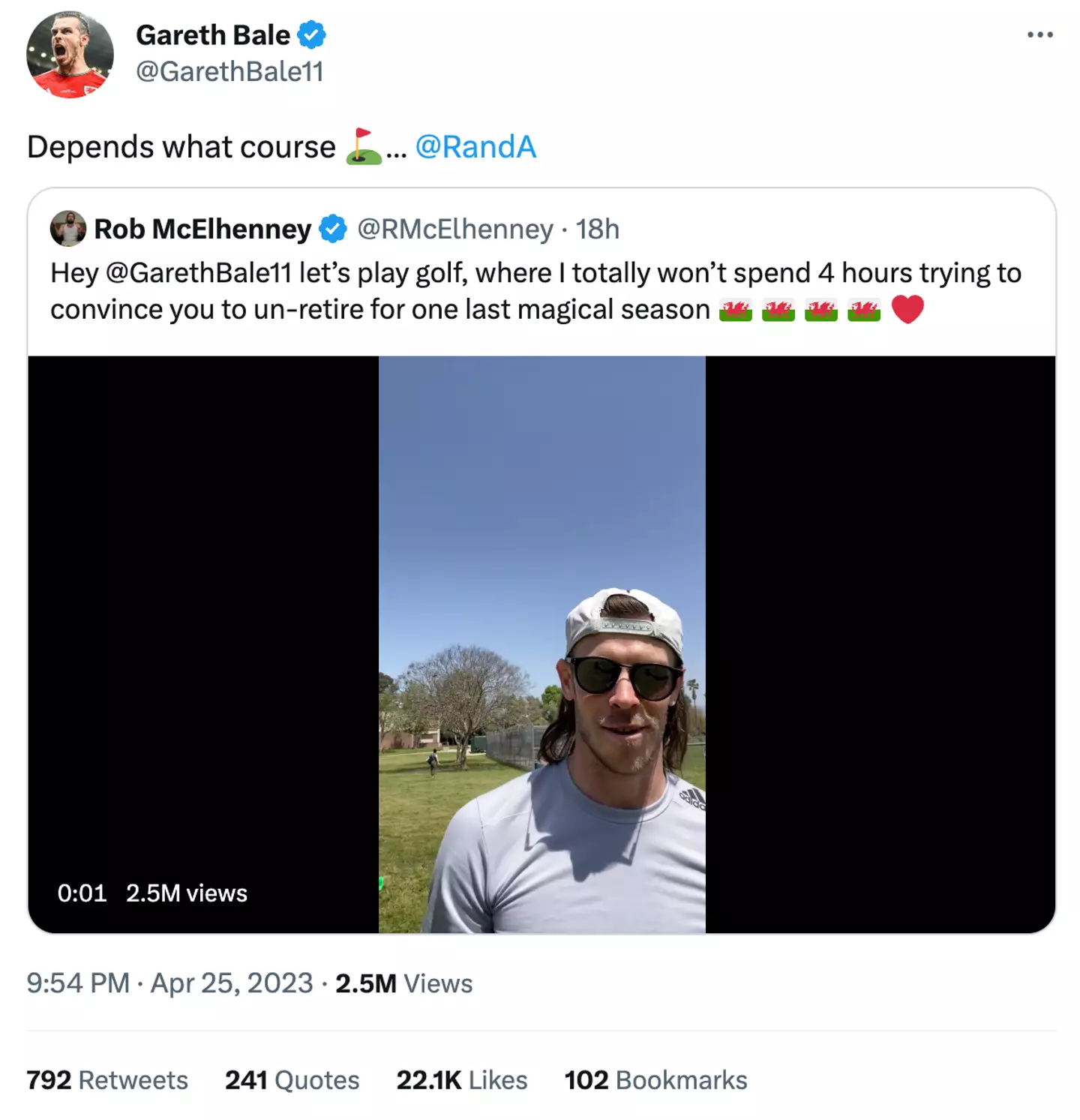 Rob laid down the gauntlet for Bale by posting on Twitter: "Hey @GarethBale11 let’s play golf, where I totally won’t spend 4 hours trying to convince you to un-retire for one last magical season."