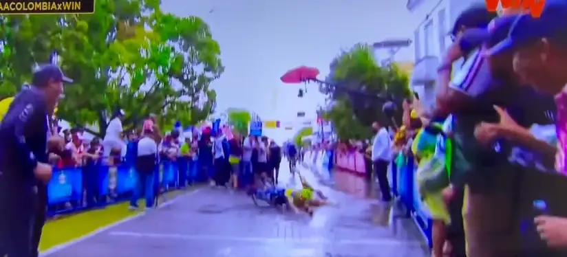 The crash left Roncancio lying on the floor, her eyes open in apparent shock as other members of the crowd gathered around to offer her help. Chia didn't escape unharmed and had to be helped off his bike before limping away from the scene.