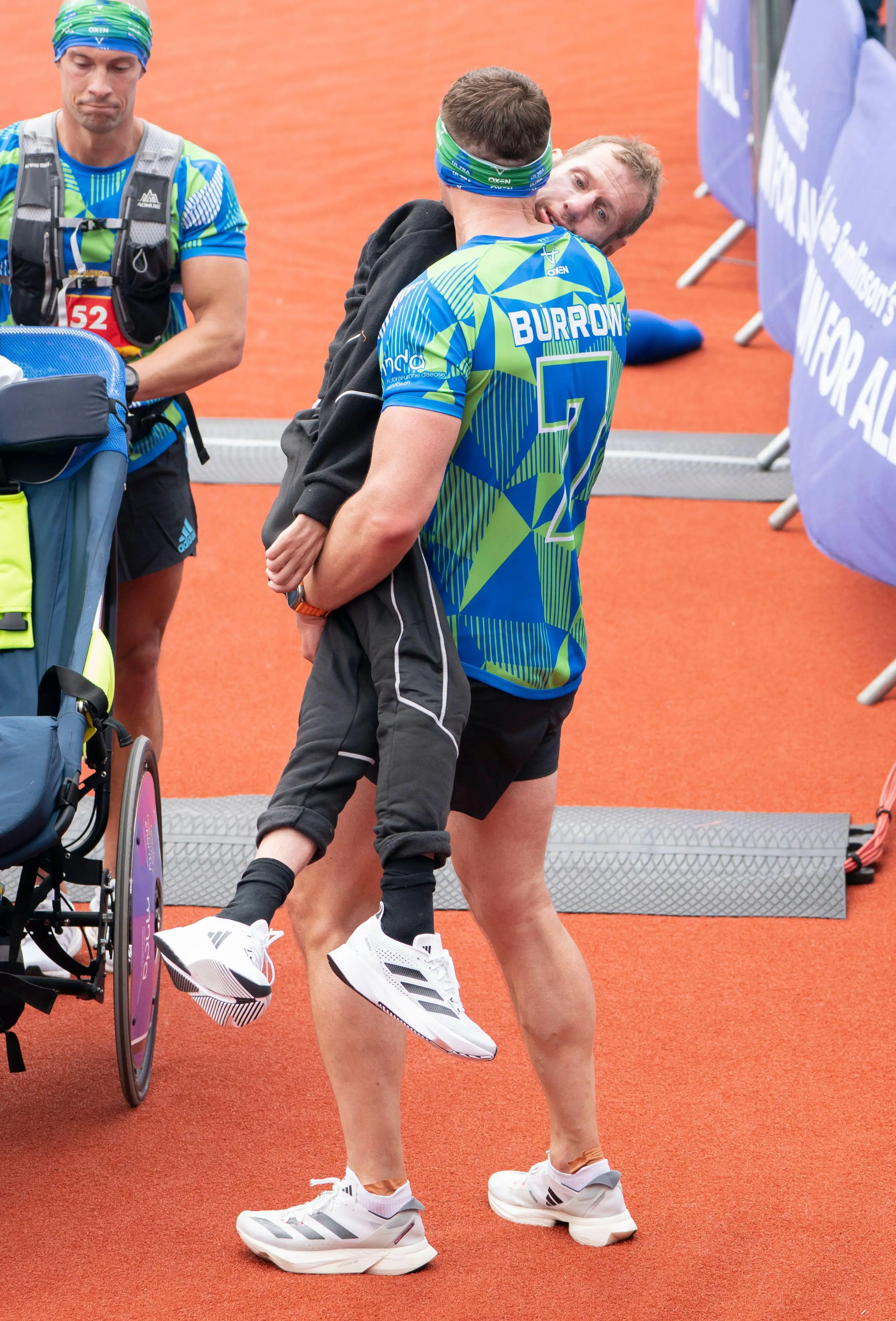 However, once the two were within steps of the finish line, Sinfield lifted Burrow and carried him over to complete the race as the crowd cheered on.
