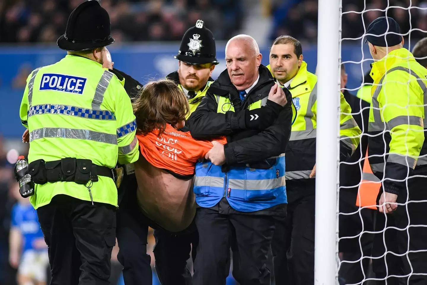 The protester ran onto the pitch during Everton 's match against Newcastle United at Goodison Park, wearing a t-shirt that said 'Just Stop Oil'.