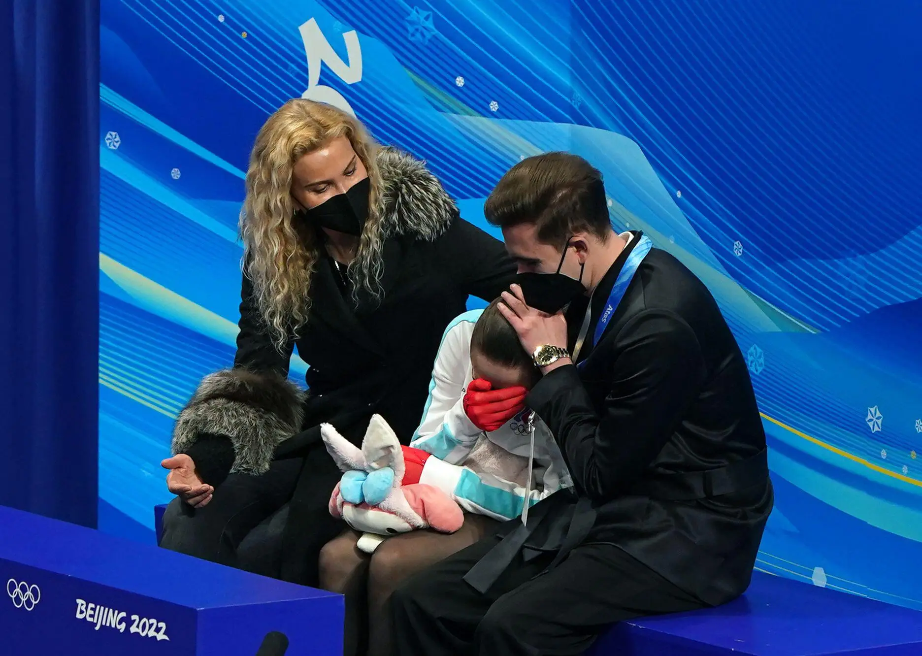 Valieva, who had shown only a few signs of pressure during her short program, struggled to maintain her composure after falling on her first triple. She left the ice in tears, and was consoled by her coach Eteri Tutberidze after the scores were announced.