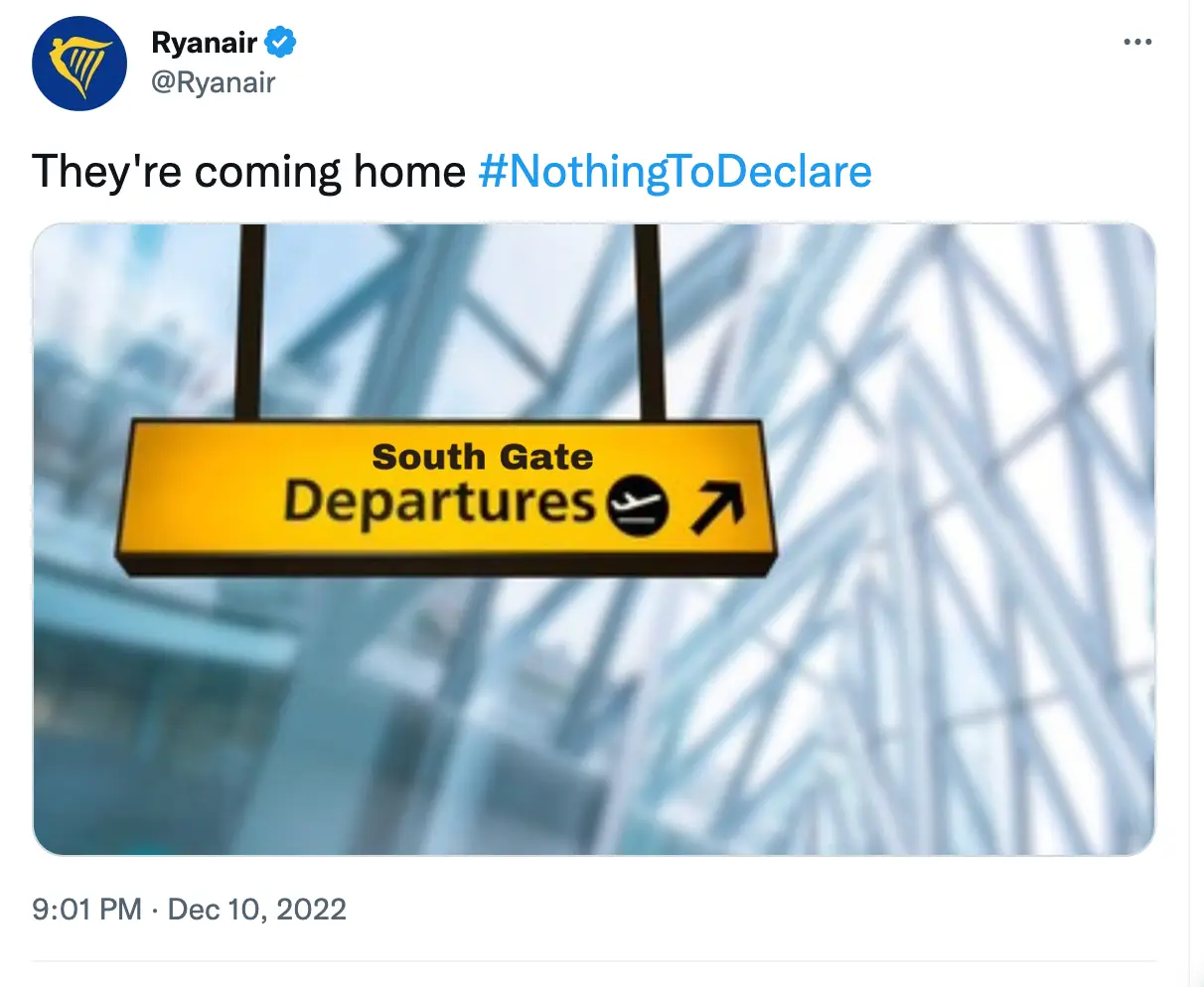 Posting a snap of a mocked up departures gate that read ‘south gate departures’ - Ryanair wrote: “They're coming home #NothingToDeclare.”