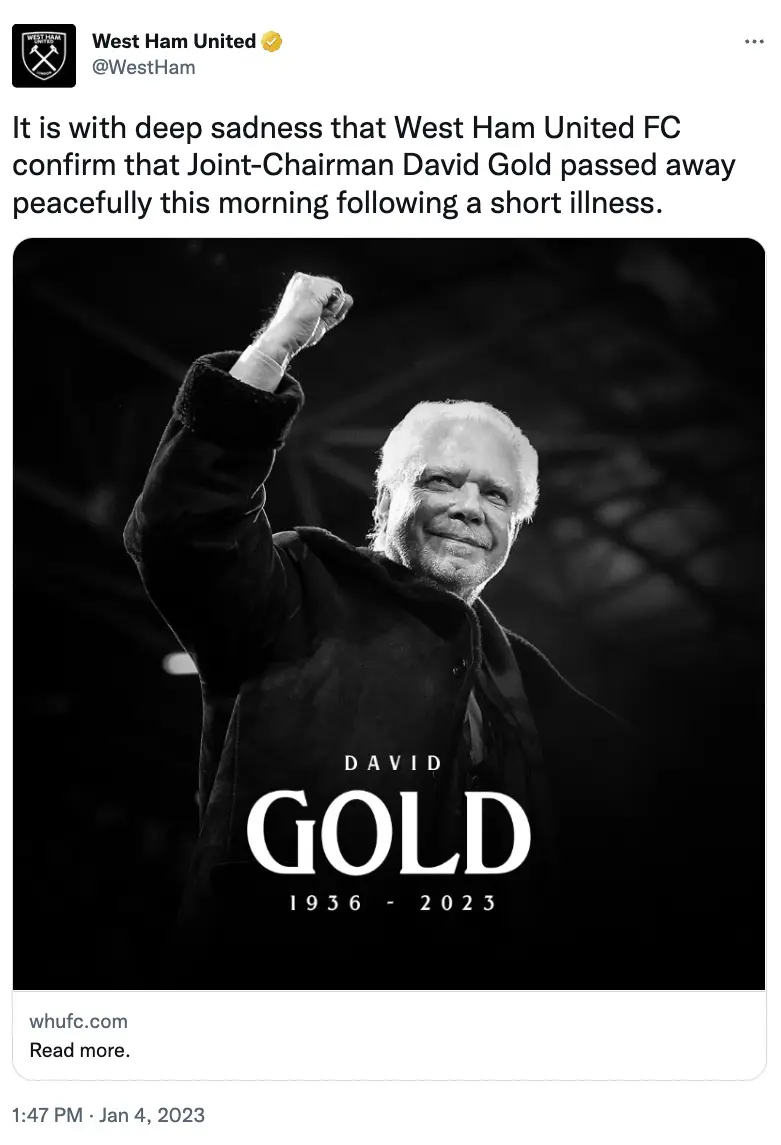 West Ham United Joint-Chairman David Sullivan shared a tribute to Gold, stating: “On behalf of everyone at the football club, it is with profound sorrow and a heavy heart that we mourn the passing of our colleague and friend, David Gold.