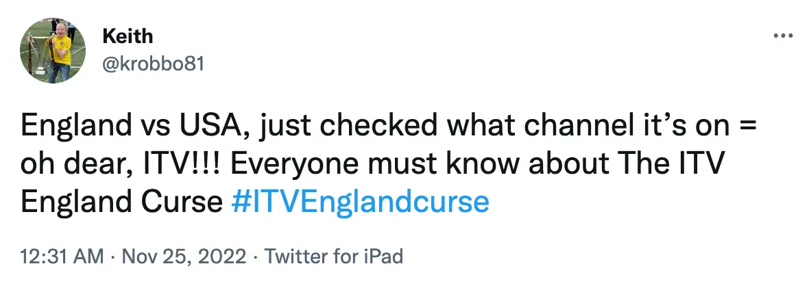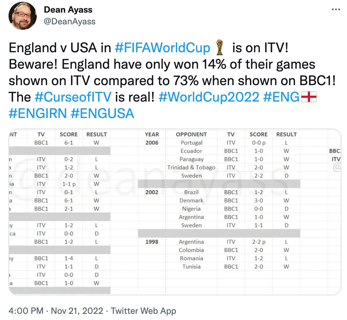 After crunching the numbers with his own spreadsheet, podcaster Dean Ayass also tweeted: “England v USA in #FIFAWorldCup is on ITV! Beware! England have only won 14% of their games shown on ITV compared to 73% when shown on BBC1! The #CurseofITV is real! #WorldCup2022 #ENG #ENGIRN #ENGUSA.”