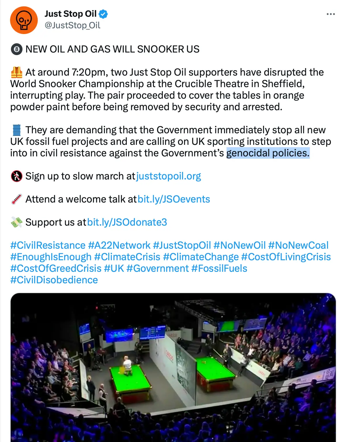 Meanwhile, Just Stop Oil has claimed responsibility in a statement on Twitter which read: "At around 7:20pm, two Just Stop Oil supporters have disrupted the World Snooker Championship at the Crucible Theatre in Sheffield, interrupting play."